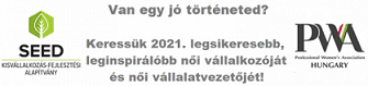 Április végén közös pályázatot írt ki a SEED Alapítvány és a Sikeres Nők Egyesülete (Professional Women’s Association – PWA), amelyben 2020 legsikeresebb női vállalkozóit és női vezetőit keresték. A pályázatra ebben a nehéz, válságos időszakban is nyolc rendkívül színvonalas pályamunka érkezett be. Az ünnepélyes díjátadóra július 9-én, a SEED Alapítvány csütörtökönként megrendezett Online Vállalkozói Fóruma évadzáró beszélgetésének keretében került sor a Margitszigeten, a Bringóhintó Kft. helyszínén.