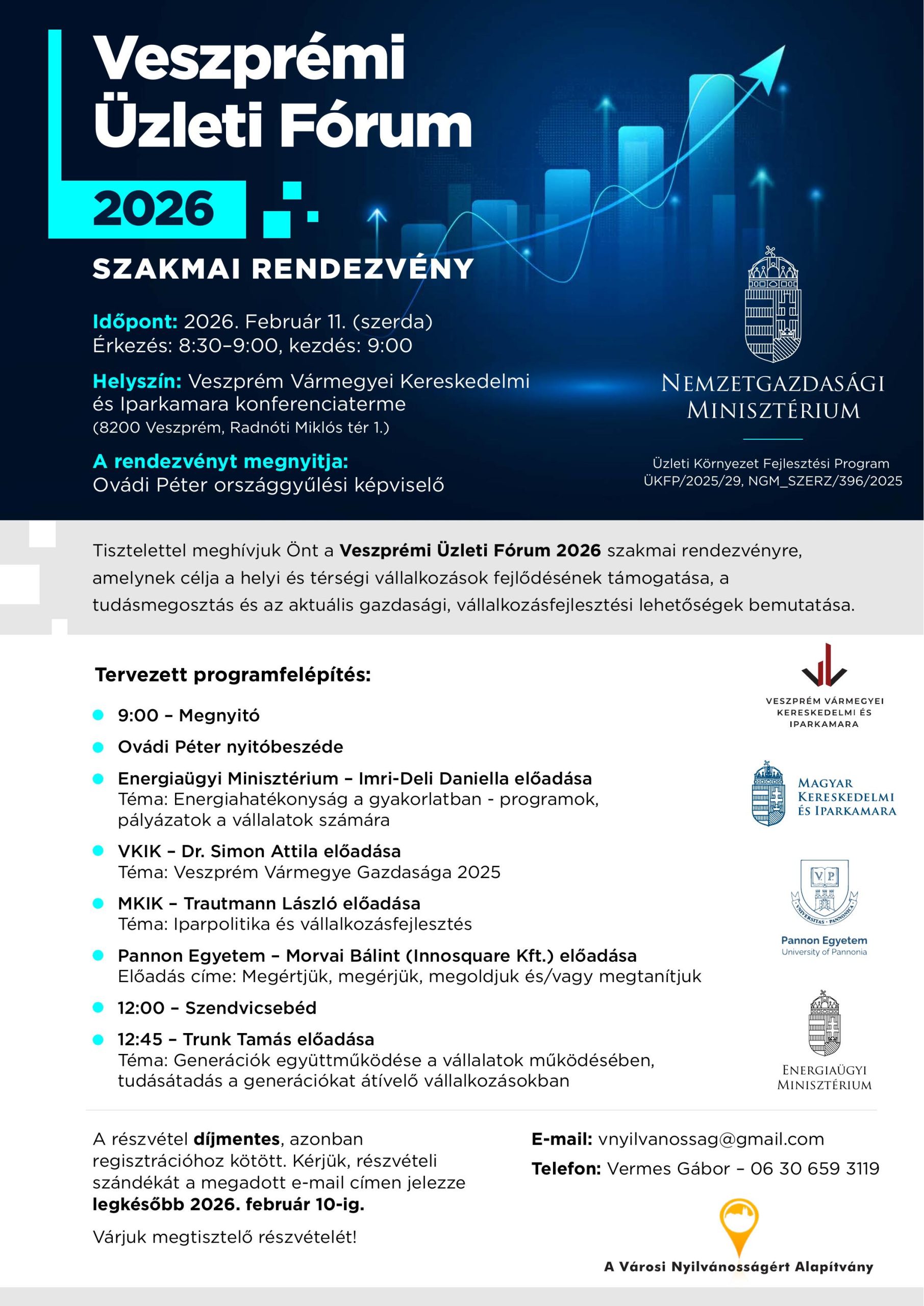 A Városi Nyilvánosságért Alapítvány a Veszprém Vármegyei Kereskedelmi és Iparkamara közreműködésével Üzleti fórumot szervez. Az esemény célja a helyi és térségi vállalkozások fejlődésének támogatása, a tudásmegosztás és az aktuális gazdasági, vállalkozásfejlesztési lehetőségek bemutatása.